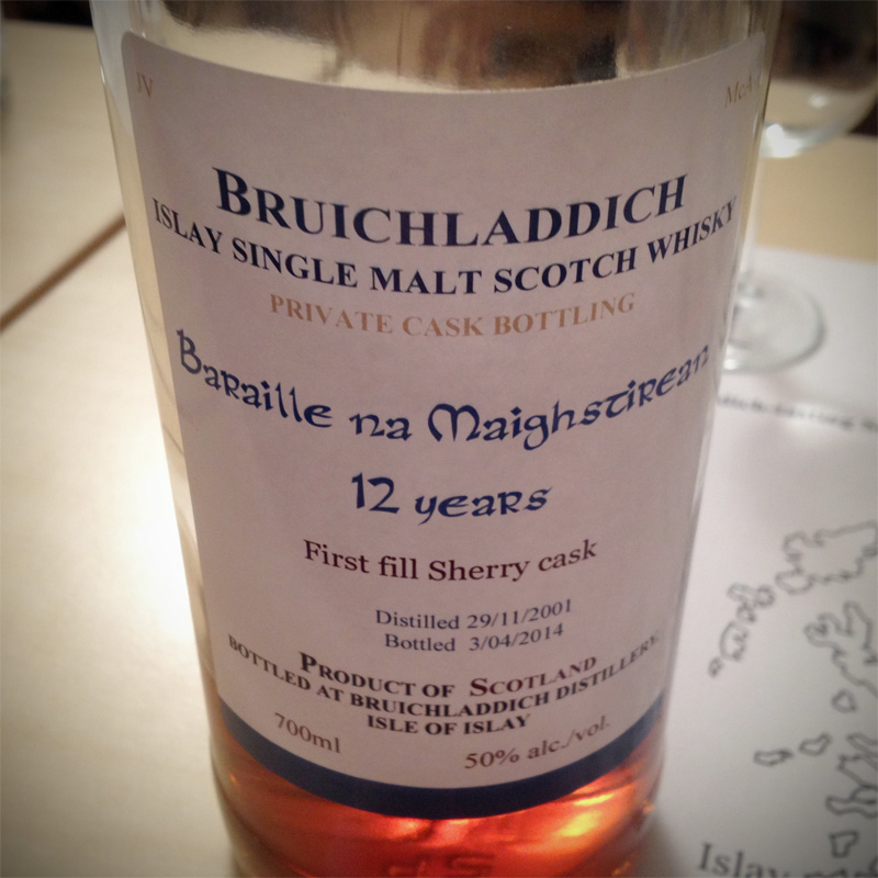 Pullote oli tarkemmin siis Bruichladdich 12 yo 2001/2014, Private Cask (50%, OB, Private Cask Bottling, 29.11.2001–3.4.2014, Baraille na Maighstirean, First Fill Sherry Cask, 70 cl). Oman huomioni tuoksussa kiinnitti viinimäisyyden ohessa melko voimakas rikkisyys. Rikin, punaviinimäisen tanniinisuuden ja kuivan nahkaisuuden läpi pääseminen vei minulta oman aikansa, mutta vähitellen aloin löytää viskistä rasvaisia ja suolaisia sävyjä, pähkinäisyyttä ja tupakkaisuutta. Ylikypsät sekahedelmät tuntuivat aavistuksen kuivilta, mutta sinänsä rancio-sävyissä oli tyyliä. Maussa rikkisyys ei juuri tuntunut, vaan rusinaiset ja tumman suklaiset sävyt palauttivat olosoron välittömästi mieleen. Ylikypsät luumut ja savumakkaraisuus maistuivat omaan suuhuni varsin herkullisilta. Jälkimaku lähti melko lakritsisella kierteellä, tumman yrttisenä ja rusinaisena, kunnes kuivui melko tammisena ja tanniinisena napakasti. Mielenkiintoinen, kuivalla tavalla suolainen öljyisyys oli tässäkin viskissä läsnä.