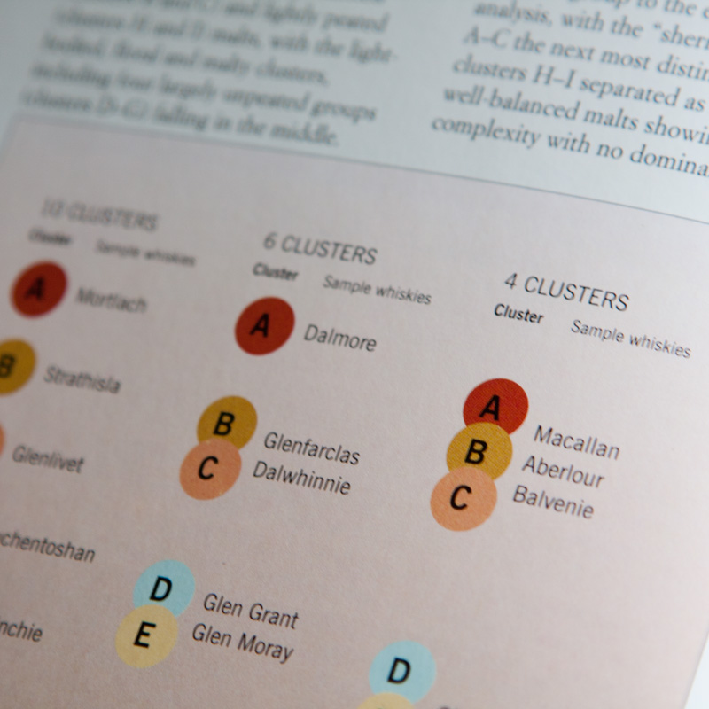 Muistan, että Wishartin tapa luokitella viskit herätti minussa yhtä aikaa kiinnostusta ja huvittuneisuutta. Tilastotieteilijä pelkistää viskit kymmeneen klusteriin, jotka ulottuivat A-ryhmän täyteläisistä ja makeista viskeistä J-ryhmän kuiviin ja turpeisiin viskeihin. Maun perusominaisuuksia jokaisella viskillä on kaksitoista, ja jokainen ominaisuus pisteytetään asteikolla 0–4. Esimerkiksi lääkemäisyyden kohdalla nolla tarkoittaa sitä, ettei ominaisuutta löydy, kun taas nelonen kuvastaa, että sitä on huomattavasti.