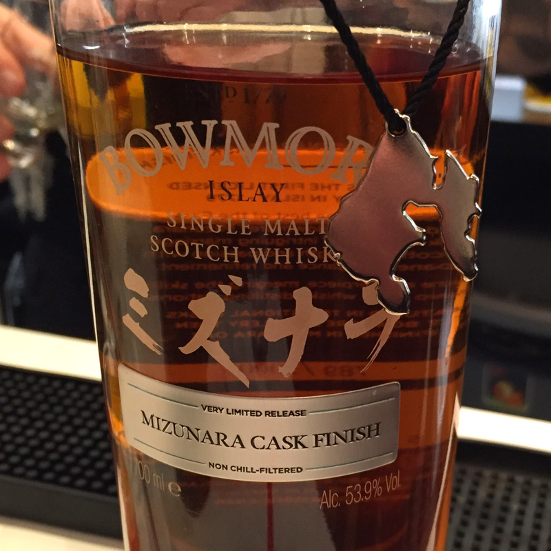Olin varannut etukäteen vain yhden tastingin, ja alkurituaaleihin jäi sopivasti tunti ennen sitä. Sen verran olin vilkaissut etukäteen Viskisiepon blogin kautta tuotekatalogia, että tiesin, mitä lähden tuoreella suulla ensimmäisenä maistamaan. Jarkko Nikkanen myi minulle huomattavaa juomalippukasaa vastaan yhden senttilitran nektaria, jota en tule koskaan itselleni pullossa ostamaan. Bowmore Mizunara Cask Finish 53,9% oli kuitenkin viski, jota halusin päästä maistamaan… koska Bowmore.