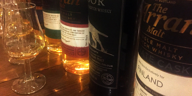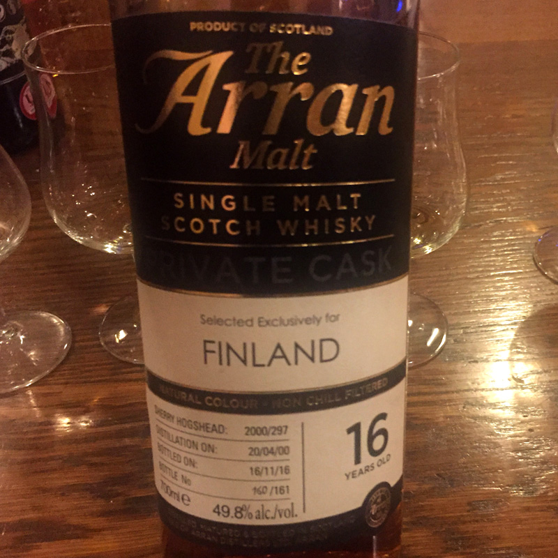 Tastingin päätökseksi oli varattu yllätys: Arran 16 yo 2000/2016 Private Cask for Finland 49,8%. Viski on valittu Suomen Mallaswhiskyseuran matkalla, oloroso hogsheadista on saatu 180 pulloa ja tuote on tulossa Alkoon myyntiin vielä tänä keväänä. Nyt kyseessä oli kuulemma ensimmäinen kerta, kun tuota viskiä maistettiin tislaamon ulkopuolella. Tuoksu tuntui sherryiseltä ja kaakaojauhemaiselta, varsin suklaiselta ja rasvaiselta. Maussa sherry hallitsee melkoisesti. Kokonaisuus on rasvainen, varsin luumuinen ja tiivisrakenteinen, vaikka runko on suhteellisen kevyt. Jälkimaku on kahvinen ja sopivan kitkerä, pähkinäinen ja suklainen. Hyvä viski tuntui olevan kyseessä kaiken kaikkiaan.