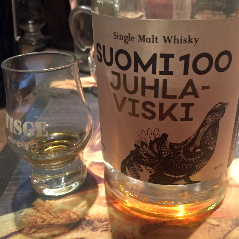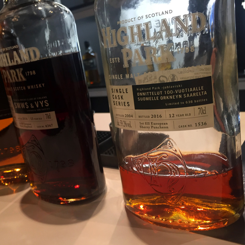 Ensimmäisenä lasiini kaatui Highland Park 12 yo 2004/2016, Suomi 100, 59,2%. Sen väri oli selvästi vaaleampi kuin vieressä olleen Highland Parkin seurapullotteen, jonka olin ennättänyt jo pariin kertaan maistaa ennen Uisgea. Juhlapullote oli muutenkin sherryisyydeltään pykälän kevyempi kuin seurapullote – enemmän vahaisuutta, hunajaisuutta ja kermaisuutta, vähemmän suklaata ja tallisia sävyjä. Ihan hyvä viski tämäkin oli, mutta järkälemäinen seurapullote vie kyllä kaksintaistelussa minun pisteeni.