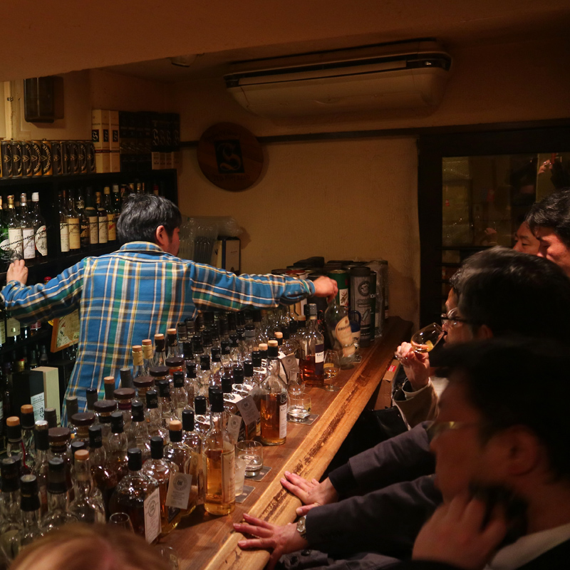 Paikan omistaja Nakamura Nobuyuki osoittautui kovaksi Islay-faniksi, jonka sydäntä lähellä on myös Springbankin hieno tuotanto. Äärimmäisen ahtaaseen kellarikoppiin on rakennettu satojen pullojen vetoinen baari, jossa istuttiin selkä seinää vasten maistelemassa viskejä. Etenkin huhtikuisena perjantai-iltana paikka oli aivan umpitäynnä salariimaneja, jotka ryystivät hienoja viskejä ja kuiskailivat toisilleen. Mutta valikoima oli hieno ja hinnat suorastaan kohtuulliset. Lasillisen loistavaa Port Elleniä sai euroissa parillakympillä.