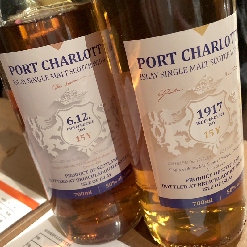 Otin itselleni sherry- ja riojatynnyrissä kypsyneen Port Charlotte 15 yo 2001/2017, ’6.12. Independence Day’ 50% -pullotteen, ystäväni valitsi sherryssä ja sauternesissa kypsyneen Port Charlotte 15 yo 2001/2017, ’1917 Independence Day’ 50% -pullotteen. Olemme suuria Port Charlotte -faneja, joten mielipiteemme oli taatusti asenteellinen: kumpikin oli suurta herkkua ja uskollista PC:n luonteelle. Itselleni riojassa käynyt kolahti jostain syystä kovemmin sen kuivakan viinisyyden ansiosta, mutta oli sauternes-versiossakin jotain niin imelää ja ylivertaisen toffeemaista, että pidin siitäkin. Kaikkineen jäi fiilis, että nämä ovat Port Charlotteja sieltä helpommin lähestyttävästä päädystä, kun muistaa, millaisia monstereita sieltä on tullut aika ajoin eteen.