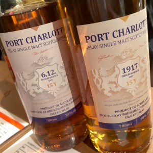 Highland Parkin Suomi-pullon äärestä suunnistimme salin perällä sijaitsevaan Pikkulinnun päivystyspisteeseen, josta on viime vuosina tullut eräänlainen Uisgen majakka. Siellä oli sopivasti hyllyssä Suomea varten pullotettu Port Charlotte -kaksikko, joka lähti siitä saman tien ristiinmaistoon.