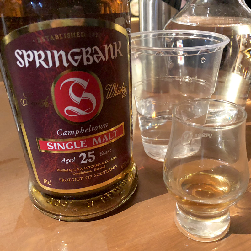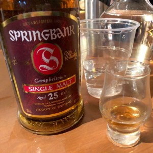 Näiden muutamien viskien jälkeen päätettiin siirtyä hetkeksi high-endiin. Nappasin Pikkulinnun tiskiltä lasiini Springbank 25 yo 46%:n, joka oli ilmeisesti vuoden 2005 paikkeilla pullotettu versio.