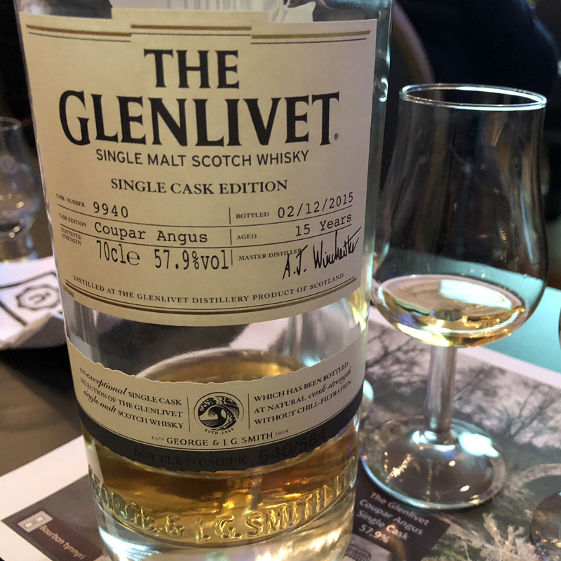 Toisena oli edessä The Glenlivet 15 yo 2015 ’Coupar Angus’ 57,9%, keväällä 2015 lanseerattu toinen pullote Pohjoismaihin. Coupar Angus on kaupunki tunnetun salakuljetusreitin varrella.
