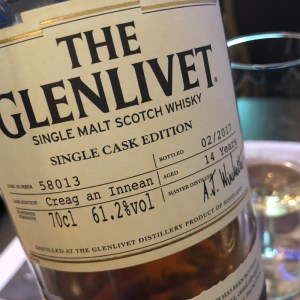 Kolmantena viskinä maistettiin The Glenlivet 14 yo 2017 ’Creag an Innean’ 61,2%. Tämä oli sarjan outolintu ja Someron mukaan vähän erilainen suhteessa Glenlivetin DNA:han. Itse viskin nimi viittaa kukkulaan, josta salakuljettajat tiirailivat virkavallan liikkeitä. Viski on kypsynyt tässä tapauksessa first fill olorosossa ja värikin oli tämän setin tummasävyisin. Suomeen tätä tuli vain 20 pulloa. Tuoksultaan Creag an Innean olikin sitten jo todella sherryinen, suklainen ja vähän rikkinen myös. Mukana oli poltettuja tulitikkuja, rusinaa, taatelia, kinuskia, kaikkineen todella paksua toffeemaisuutta. Varsin täyteläistä ja runsasta makua hallitsi sherryinen, öljyinen ja rusinainen maisema. Erittäin napakka mausteisuus pysyi mukana koko ajan, pippuria ja inkivääriä riitti. Niitä tasapainottamassa oli toffeeta, piparkakkua ja hilloisuutta. Jälkimaku liikkui suklaisella ja mausteisella tontilla, jossa riitti lujaa mausteisuutta, mustapippuria ja inkivääriä. Tammi kuivahti lopuksi reippaasti, mutta kinuski piti pintansa piparkakun ja maustepippurin voimin. Voimakkaiden makujen ja sherryviskien ystävälle tämä oli tastingin paras viski.