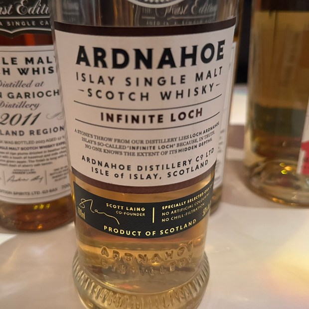 Ennen tastingia ehti vielä yhden viskin maistaa, ja se oli lopulta Hunter Laingin uuden Ardnahoen tislaamon Ardnahoe Infinite Loch 50% suoraan Islaylta. Ensikosketukseni tislaamon tuotantoon oli heti myönteinen. Viski oli ensinuuhkaisusta alkaen erittäin kuiva ja mineraalinen, nenässä oli jopa kalkkia ja tuhkaa, maussa runsaasti suolaisuutta ja nautinnollisen kuivakkaa purevuutta. Suolakivi jäi tuntemuksena päällimmäisenä mieleen. Jälkimausta ei oikein voinut vielä paljon puhua, sen verran nuorelta tuote tuntui, mutta suurella mielenkiinnolla odotan, millaiseksi tislaamon tuotanto tulevina vuosina muodostuu.