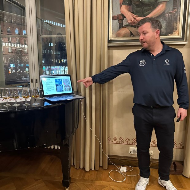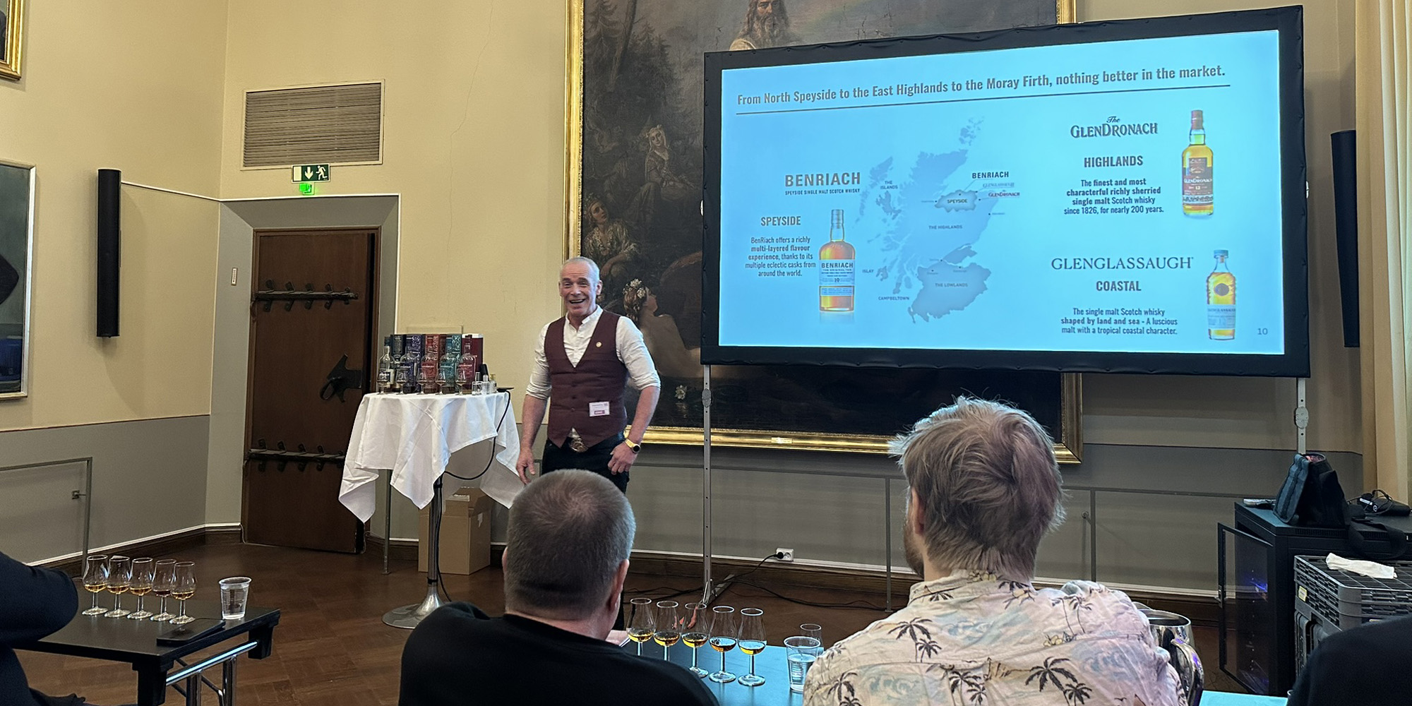 Näiden aloitusviskien jälkeen oli aika siirtyä ensimmäiseen tastingiin. Glendronachin tislaamon uutta tuotantoa meille esitteli kokenut Suomen-kävijä, tislaamon global brand ambassador Stewart Buchanan suoraan Elginistä. Itse en ollut hänen vetämäänsä tastingiin aiemmin osallistunut, mutta fiilis oli heti kohollaan, kun hän esitteli ”heidän” tislaamonsa, joista olin jokaisella käynyt. Glendronachin ja BenRiachin lisäksi tähän Bermudan kolmioon kuuluu rannikolla sijaitseva Glenglassaugh, jonka tuotannon jatkuvuudesta heräsi tietysti heti yleisössä kysymyksiä. Buchanan vakuutti, etteivät yhtiön henkilöstömuutokset suinkaan tarkoita tuotannon lopettamista tislaamossa. Glenglassaugh on muutenkin käynyt puoliteholla viime vuodet, ja näin varmaan jatkuukin. Siellä olisi kapasiteettia tuplata tuotanto, mutta sitä ei ole tässä markkinatilanteessa tehty, kun raaka-ainekustannuksetkin ovat raketoineet koronan ja Ukrainan sodan jälkeen.