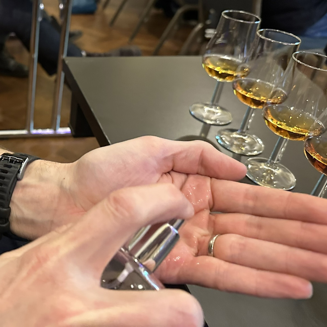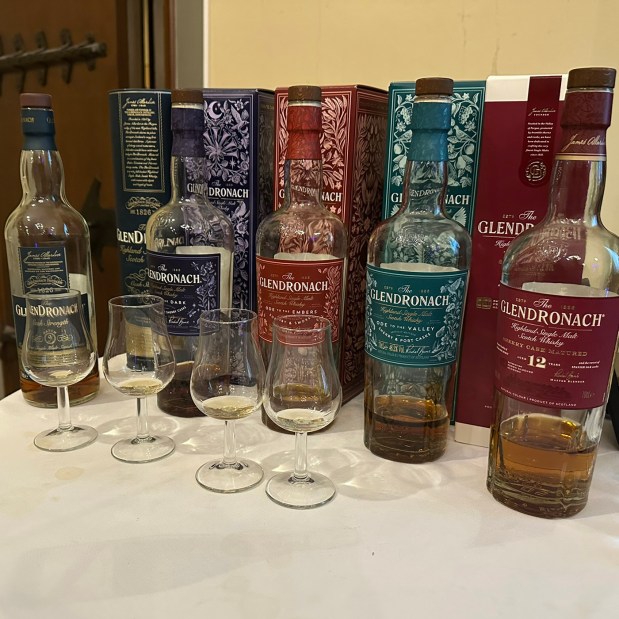 Itse tasting alkoi kuitenkin parfyymipulloilla. Buchanan laittoi kiertämään kolme pientä suihkepulloa, joissa oli BenRiachin, Glenglassaugh’n ja Glendronachin raakatisleet. Niitä saatiin suihkuttaa käsiin, hieroa alkoholit pois ja tuoksutella. Erot tulivat kieltämättä mukavasti esiin. Varsinaiset viskit aloitettiin uudella 12-vuotiaalla: Glendronach 12 yo 43% (2024)oli jo aiemmin käynyt lasissani, ja tiesin sen oikein hyväksi perustuotteeksi. Sekoituksessa on Buchananin mukaan nykyisellään noin 60 prosenttia ex-bourbonia ja noin 40 prosenttia PX:ää.