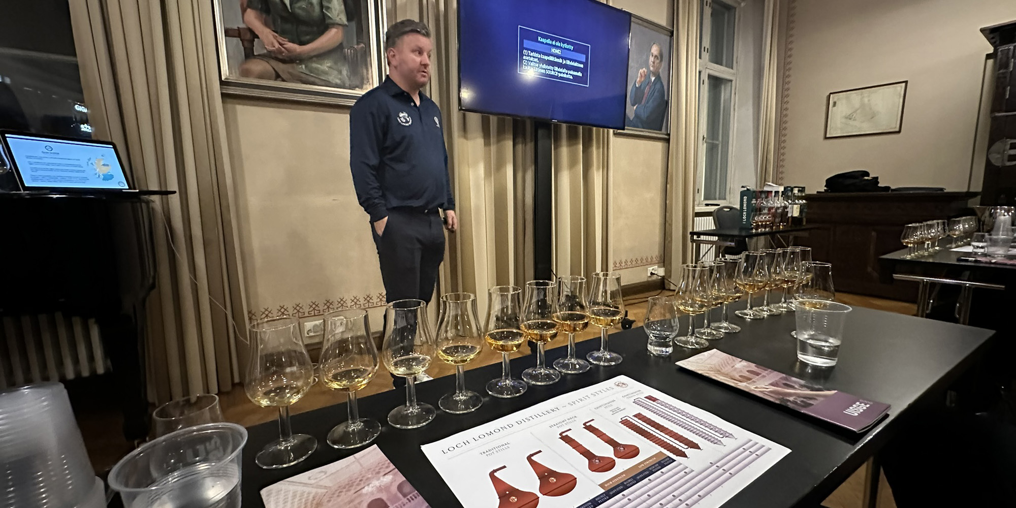 Illan toinen tasting alkoi yhdeksältä, ja olimme siellä ystäväni kanssa hetken aikaa ainoina paikalla, ennen kuin viisi muuta osallistujaa saapuivat. Brand ambassador Alan Reid oli saapunut esittelemään meille Loch Lomondin ja Glen Scotian tuotantoa. Pakko on nostaa Reidin työmoraalille hassua, koska todella vähäisestä osallistujamäärästä huolimatta hän pani kaiken peliin eikä oikaissut missään kohtaa.