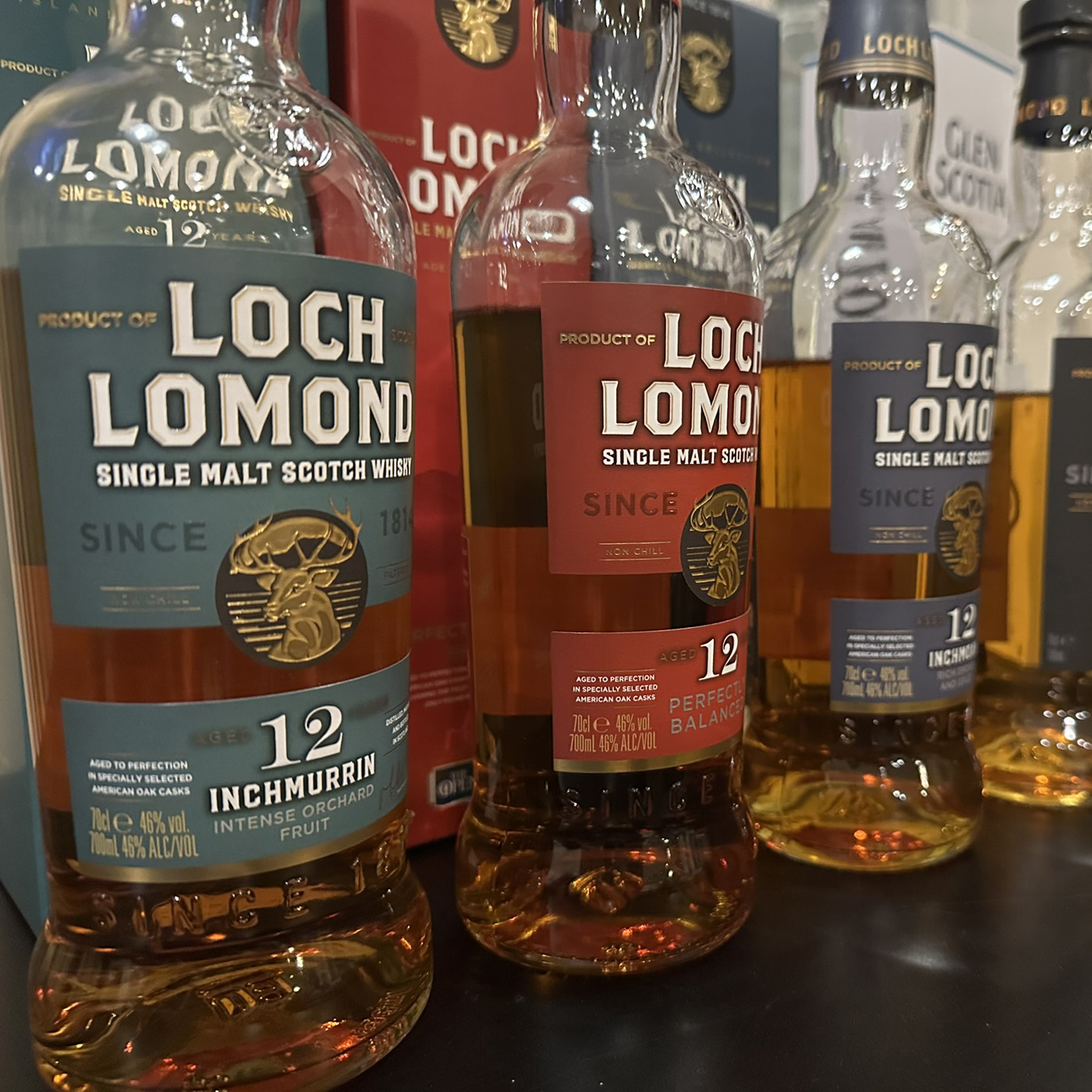 Ensimmäisenä viskinä maistettiin kevyt Loch Lomond Inchmurrin 12 yo 46%. Makea ja hedelmäinen viski oli kaikin puoli helppo tapaus. Maitosuklainen ja ruohoinen yleisilme johdatteli hyvin aiheeseen. Viskissä itsessään ei ollut mitään erityistä vikaa. Toisena vuorossa oli Loch Lomond 12 yo 46% eli nykyinen perustuote. Sekin oli ihan hyvässä formussa. Kokonaisuudessaan se oli pykälää maltaisempi ja paahteisempi kuin kevyttäkin kevyempi Inchmurrin. Tämän avaustrilogian päätti 50 ppm:n tasoille turpeistetusta maltaasta tehty Loch Lomond Inchmoan 12 yo 46%. Se oli tästä kevyestä kolmikosta lopulta kaikkein onnistunein kokonaisuus, sinänsä aivan mainio yhdistelmä mangomaista hedelmäisyyttä ja mineraalista turpeisuutta ilman mitään sen kummallisempaa viritystä.
