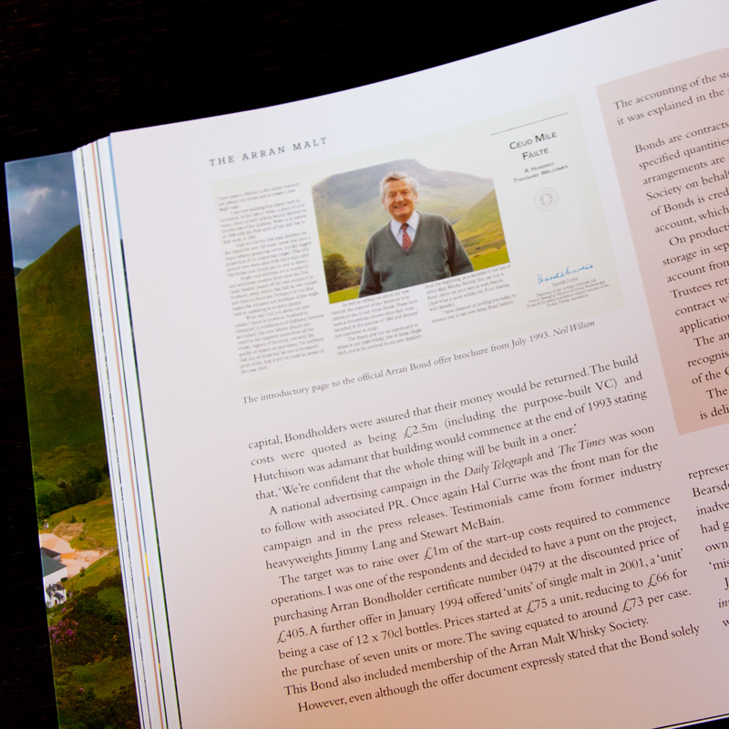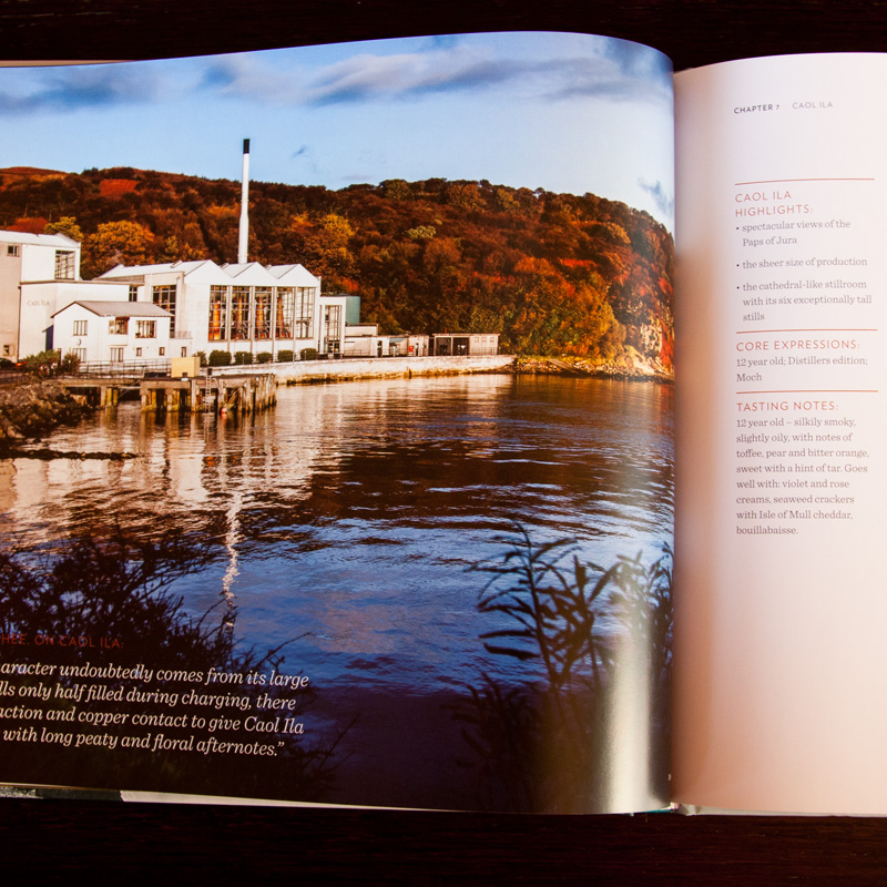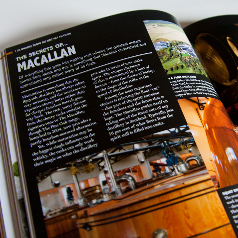 Maittain etenevän viskiesittelyputken keskelle on saatu upotettua aukeaman kokoisia feature-osuuksia. Käytännössä niitä on kolmea tyyppiä: 1) All about… (peat, casks, etc.), 2) Whisky styles (Blends, Bourbon, etc.), 3) The secrets of… (Laphroaig, Yamazaki, etc.). Yhteensä viimeisen tyypin viskitislaamoesittelyissä käydään läpi kahdeksan nimekästä tislaamoa Skotlannista, Irlannista, Yhdysvalloista ja Japanista. Nuo tislaamot ovat Laphroaig, Macallan, Talisker, Bushmills, Midleton, Jack Daniel’s, Maker’s Mark ja Yamazaki.