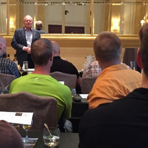 Näiden aloitusviskien jälkeen oli aika siirtyä ensimmäiseen tastingiin. Glendronachin tislaamon uutta tuotantoa meille esitteli kokenut Suomen-kävijä, tislaamon global brand ambassador Stewart Buchanan suoraan Elginistä. Itse en ollut hänen vetämäänsä tastingiin aiemmin osallistunut, mutta fiilis oli heti kohollaan, kun hän esitteli ”heidän” tislaamonsa, joista olin jokaisella käynyt. Glendronachin ja BenRiachin lisäksi tähän Bermudan kolmioon kuuluu rannikolla sijaitseva Glenglassaugh, jonka tuotannon jatkuvuudesta heräsi tietysti heti yleisössä kysymyksiä. Buchanan vakuutti, etteivät yhtiön henkilöstömuutokset suinkaan tarkoita tuotannon lopettamista tislaamossa. Glenglassaugh on muutenkin käynyt puoliteholla viime vuodet, ja näin varmaan jatkuukin. Siellä olisi kapasiteettia tuplata tuotanto, mutta sitä ei ole tässä markkinatilanteessa tehty, kun raaka-ainekustannuksetkin ovat raketoineet koronan ja Ukrainan sodan jälkeen.