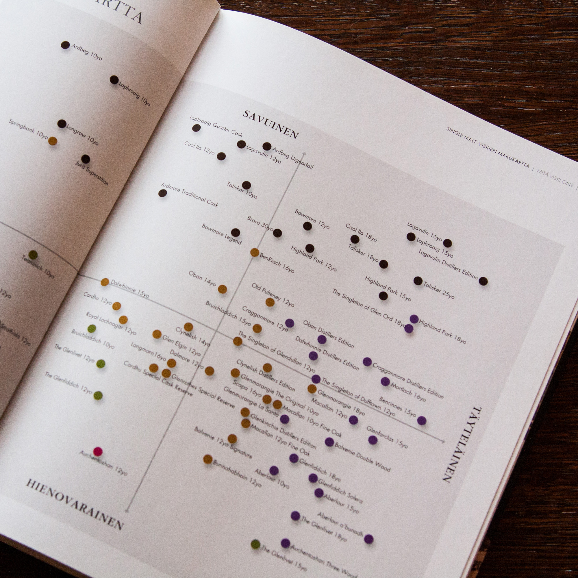 Näiden kahden herkkiksen jälkeen siirryimme syvään päähän: oli pakko ottaa käsittelyyn paljon puhuttu Kuusikko 49 % Blended Malt. Kuusikossa on nimensä mukaisesti kaikkien suomalaisten tislaamojen tuotteita, eli sekoitukseen käytetty HDC:n ruismallasviskiä, Kyrö Woodsmoke -ruismallasviskiä, Ägräksen turpeista viskiä ex-olorososta, Teerenpelin turpeista viskiä ex-sherrystä, Valamon turpeistamatonta viskiä ex-bourbonista ja Beer Hunter’sin turpeista Old Buckia ex-bourbonista. Ensikohtaaminen Kuusikon kanssa oli kieltämättä melko tyrmäävä, koska ruisviskihän siitä tuli rajusti läpi välittömästi – ja itse en ruisviskistä pidä lainkaan. Kunhan tuoksusta selvisi, maku tuntui pihkaiselta, turpeiselta ja vähän epäpuhtaalla tavalla likaiselta. Mukana oli runsaasti sisupastillia ja jonkin verran liimaisuutta, havuja ja kitkeryyttä. Varmasti Kuusikosta voi joku tykätäkin, en sitä epäile, mutta itselläni jäisi kyllä pullo juomatta.