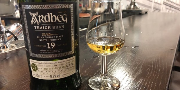 Maistelussa heti tuoreeltaan uusi Ardbeg, 19-vuotias Traigh Bhan. Näitä tuli Suomeen tiettävästi 50 pullon satsi, kaikki ravintolamyyntiin. Nyt lasissa siivu yhdestä avatusta. Ikämerkintä on jo sinänsä ilahduttava asia kaikkien tohtoroitujen NAS-julkaisujen jälkeen.