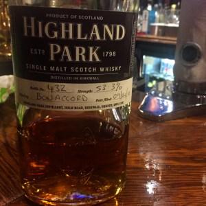 Päädyimme tuolloin hiukan huokeampiin drameihin, joita siirryttiin rauhalliseen syrjäpöytään nauttimaan. Maistelin lasillisen Bon Accordin nimiin käsin pullotettua Highland Parkia, joka oli selvästi peräisin ex-sherrystä mutta josta ei sen tarkempia tietoja ole löytynyt. Viskin alkoholipitoisuus oli 53,3%, täyttöpäivä 9. huhtikuuta 2016 ja pullon numero 432. Hyvää oli. Kaverini otti tuolloin lasillisen Tobermoryn 20-vuotiasta, ex-olosorossa kypsynyttä virallista tislaamopullotetta. Maistui sekin kyllä.
