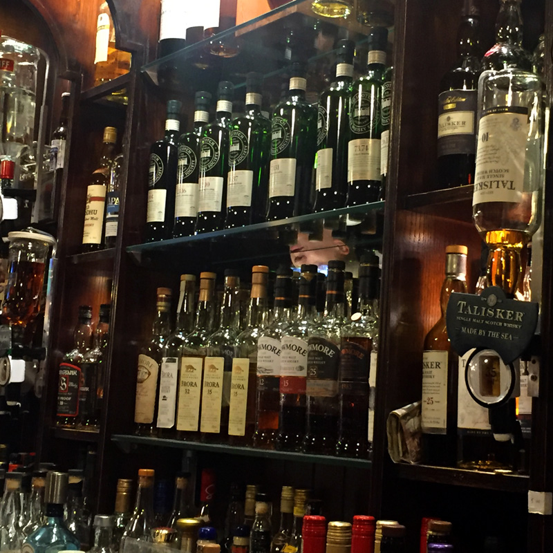 Viskivalikoima oli tuolloin kuitenkin erittäin pysäyttävä. Ylähyllyllä kiilteli Gordon & MacPhailin pisaranmuotoiseen dekantteriin pullotettu 70-vuotias Glenlivet, josta olisi päässyt pulittamaan 900 puntaa per 35 millilitraa. Hiukan ”maltillisemmissa” hinnoissa olivat sentään White Bowmore 150 punnan ja Bowmore 1957 runsaan 200 punnan hintalapuilla. Broran tislaamopullotteita oli kokonainen rivi, mutta nekin olivat varsin kovissa hinnoissa, samoin Port Ellenit. Scotch Malt Whisky Societyn pullotteita oli runsaasti. Yksittäisistä pulloista silmään tarttui esimerkiksi 40-vuotias Old Pulteney.