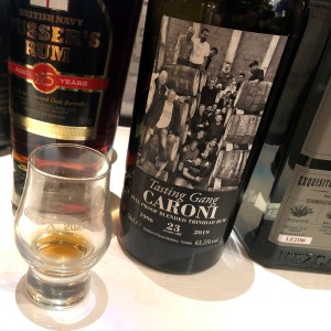 Näiden kolmen viskin jälkeen maistelin hiukan huolettomammin vielä pari juomaa, ennen kuin lähdin. Aivan pakko oli käydä Philippe Hakulinilta hakemassa Caroni 23 yo 1996/2019, Velier ’Tasting Gang’ 63,5% -siivu. Olin maistanut sitä jo aiemmin ja vaikuttunut – niin kävi edelleen. En ole halunnut sotkea laaturommeja tähän blogiin ollenkaan, mutta on niitäkin tullut vuosien saatossa maistettua jonkin verran: Foursquarea, Enmorea, Hampdenia, Worthy Parkia, Uitvlugtia, Diamondia… Caroniin olen erityisen koukussa ja monien muiden tapaan harmissani siitä, että saatavuus alkaa olla niin mahdottoman heikko. Philippe oli saanut tätä Caronia kuusi pulloa, eikä enempää ole enää Luca Garganolta tällä tietoa tulossa. Se on suunnaton sääli, koska Velierin pullottamat iäkkäät Caronit ovat olleet erityisen legendaarisia.