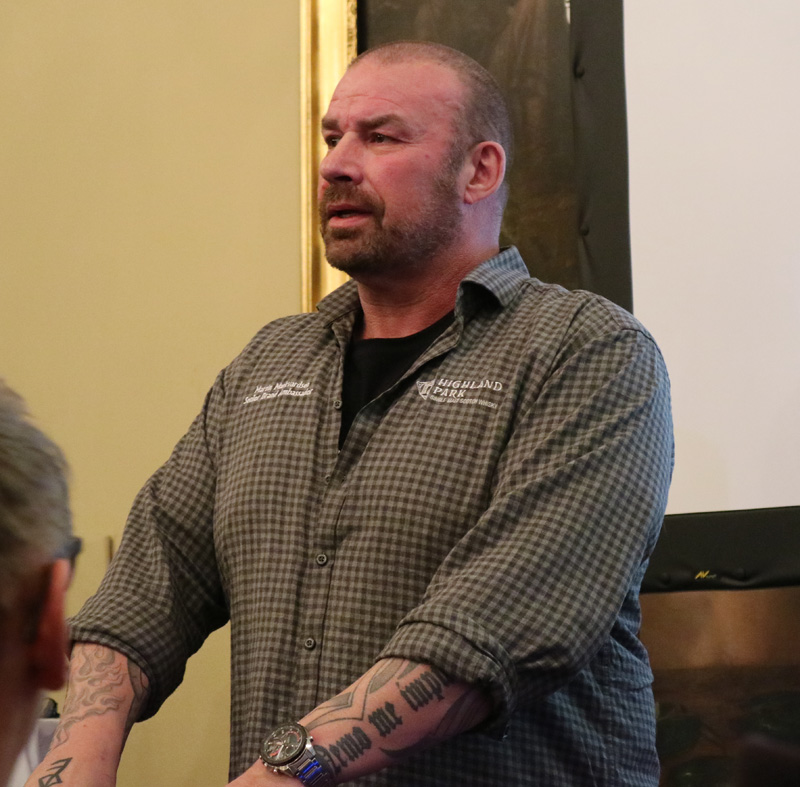 Triskellionin jälkeen kuunneltiin tarinaa Orkneyn saaresta ja itse tislaamosta, ennen kuin tehtiin parivertailu 18-vuotiailla pullotteilla. Highland Park 18 yo Viking Pride 43% oli tuttua tavaraa, olin tätä uutta pullotetta maistellut jo viime syksynä ja todennut kelvolliseksi. Siinä yleisöä kiinnosti erityisesti tuotteen muutos vuosien saatossa. Kun alkuperäinen 18-vuotias julkaistiin vuonna 1998, totta kai tuote on muuttunut siitä. Martin muistutti rehellisesti, että enää ei ole samalla tavalla varaa käyttää vanhoja tynnyreitä; aikoinaan 18-vuotiaan keskimääräinen ikä saattoi kuulemma olla 30 vuotta. Tosin välissä on sattumoisin tullut näitä viikinkiaiheita muualtakin. ”Kun olimme julkaisseet Thorin, tuli Thor-elokuva. Aika hyvä juttu, eikö? Ja nyt tuli Vikings-sarja. Hyvä, että oltiin ennen sitä liikkeellä…”